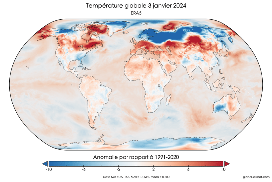 Par exemple, la carte du 3 janvier 2024 montre les anomalies relatives à 1991-2020 au lieu de 1981-2010 (utilisée sur Global-Climat.com jusqu’à fin 2023).
