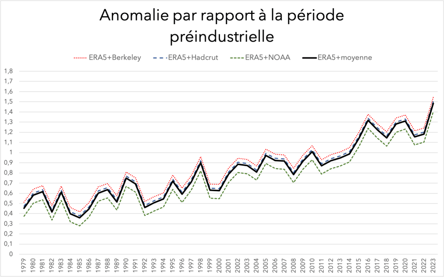 Le graphique ci-dessous montre l’évolution de l’anomalie globale annuelle de 1979 à 2023 par rapport à la période 1850-1900. On peut y voir les anomalies calculées à partir d’ERA5+Berkley Earth, ERA5+HadCRUT5, ERA5+NOAA et la ERA5+la moyenne des trois (Berkeley, HadCRUT, NOAA).