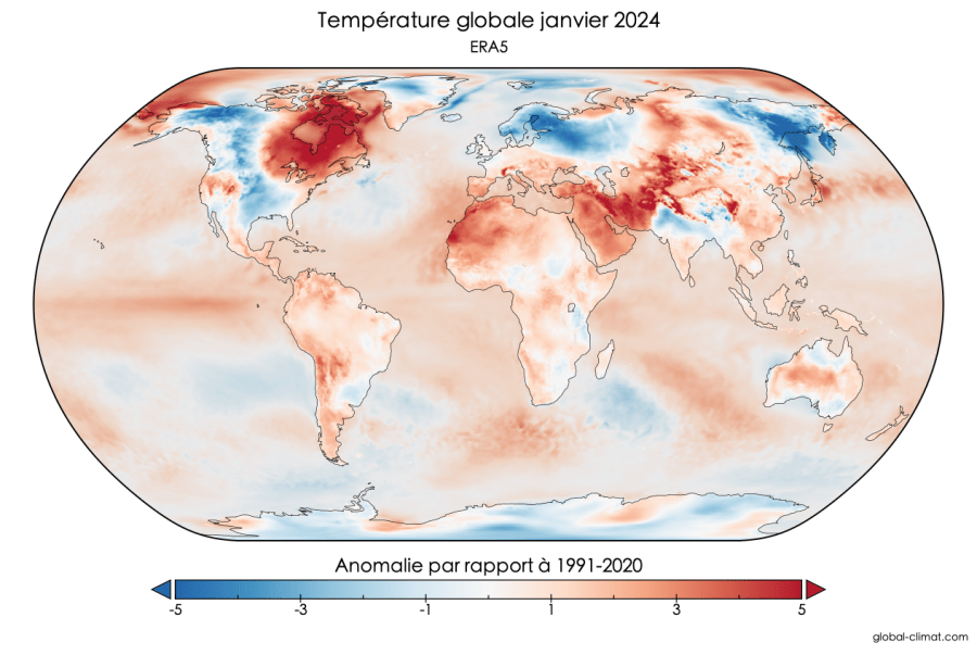 Avec +0.70°C au-dessus de la moyenne 1991-2020, le mois de janvier 2024 est le plus chaud des annales ERA5 qui remontent à 1979. Après juin, juillet, août, septembre, octobre, novembre et décembre 2023, c’est le 8e mois d’affilée marqué par un record de chaleur.