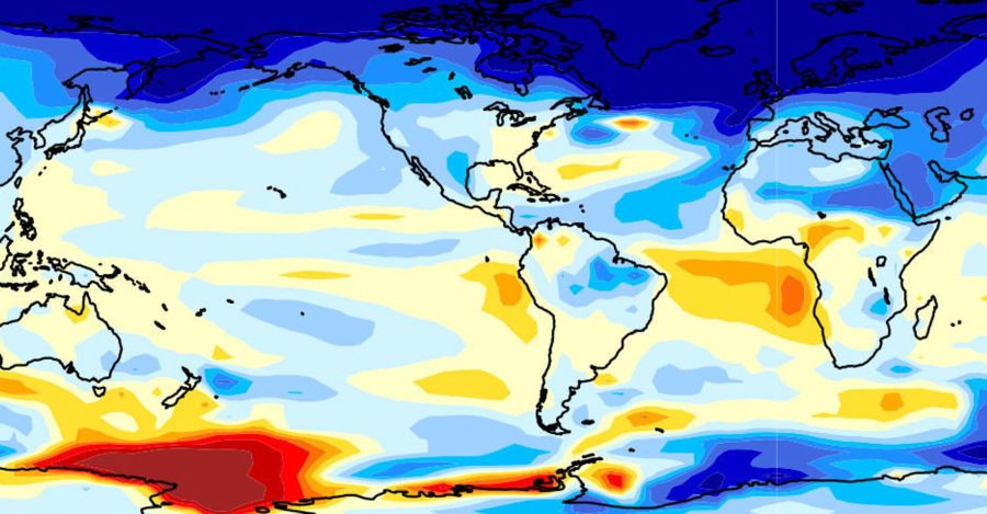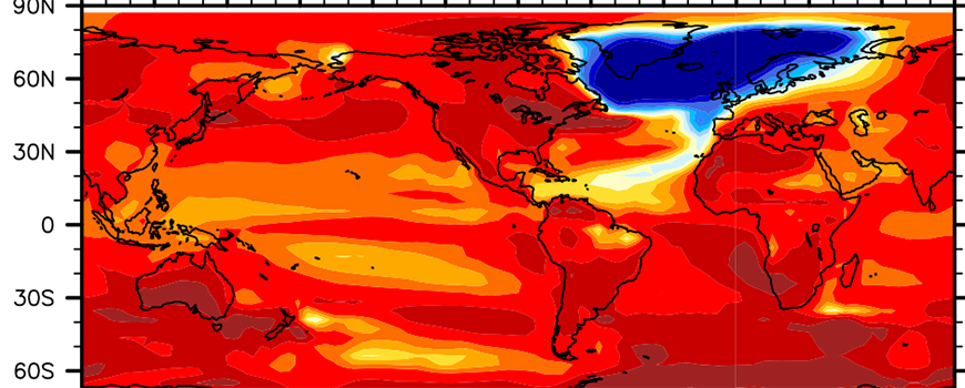 Prévisions de températures après l’arrêt de la circulation océanique. Le froid dans le Nord de l’Europe (en bleu) est le plus évident, la température de parties de l’hémisphère Sud s’élève (en rouge).
