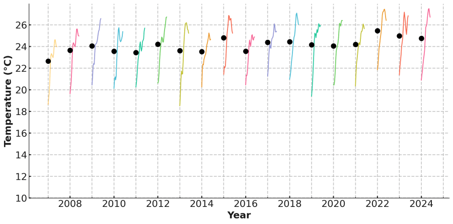L’an dernier, j’ai eu l’opportunité de mener un projet de recherche à l’EPFL, l’École Polytechnique Fédérale de Lausanne. Mon travail s’est concentré sur un sujet à la fois technique et brûlant — au sens propre : l’évolution de la température de la Méditerranée. Pour cela, je me suis appuyée sur les relevés fournis quotidiennement par le MetOffice britannique. Cette institution collecte chaque jour les températures de l’eau en plus de 160 000 points à travers la mer Méditerranée. Les données, une fois traitées, sont mises à disposition sur la plateforme européenne Copernicus, vaste base d’observations du climat. Sur ce graphique chaque ligne de couleur représente les températures de juin à août d’une année lissées, 2007 en jaune, l’été 2008 en rouge, l’été 2009 en violet. L’eau est généralement plus fraîche en juin et la plus chaude fin juillet ou en août. Le point noir indique la moyenne de l’été.